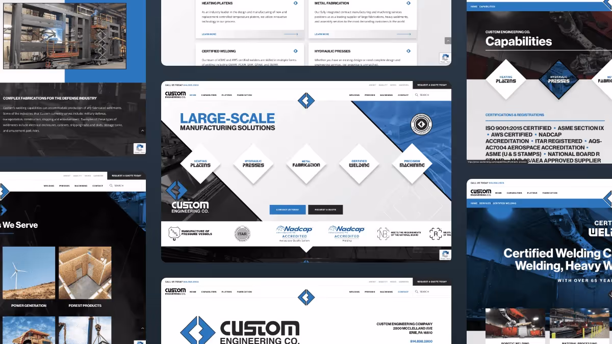 Custom Engineering Co. is a large-scale fabrication company based in Erie, PA and is the subject of this industrial website design case study. The company was founded in 1955 and specializes in designing and producing heated platens, hydraulic presses, metal fabrication, certified welding, and precision machining. Custom Engineering serves a variety of industries, including oil and gas, transportation, power generation, entertainment, DOE & DOD, mining, construction, and more. In addition to Custom Engineering's manufacturing capabilities, the company offers design and engineering services to its customers. Custom Engineering Co. has a team of experienced engineers that work closely with clients to develop customized solutions to meet their unique requirements. Custom Engineering has excelled with its exceptional customer service while maintaining long-term client relationships. In this case study, we will look closer at the solutions we provided for Custom Engineering with the new custom industrial website design we created and built for them.