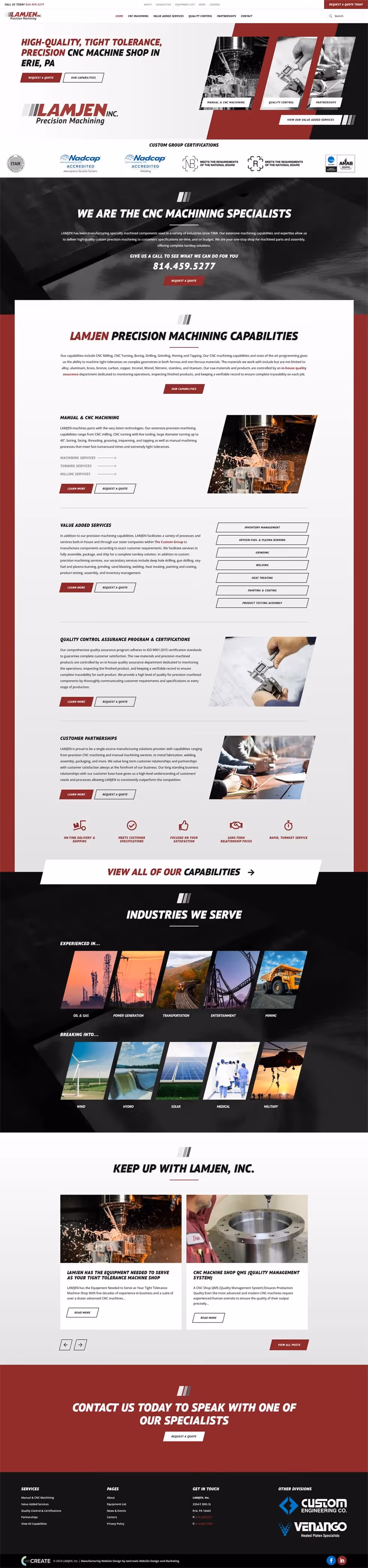Following the layout of the Custom Group, Venangomachine.com provides yet another example of great user experience, clear display of specialties, well designed search engine optimized content, and readily available calls to action. The site is visually stimulating and does a fantastic job of displaying branded elements. Like the other websites in the group, Venango Machine saw significant increases in traffic and leads after launch.